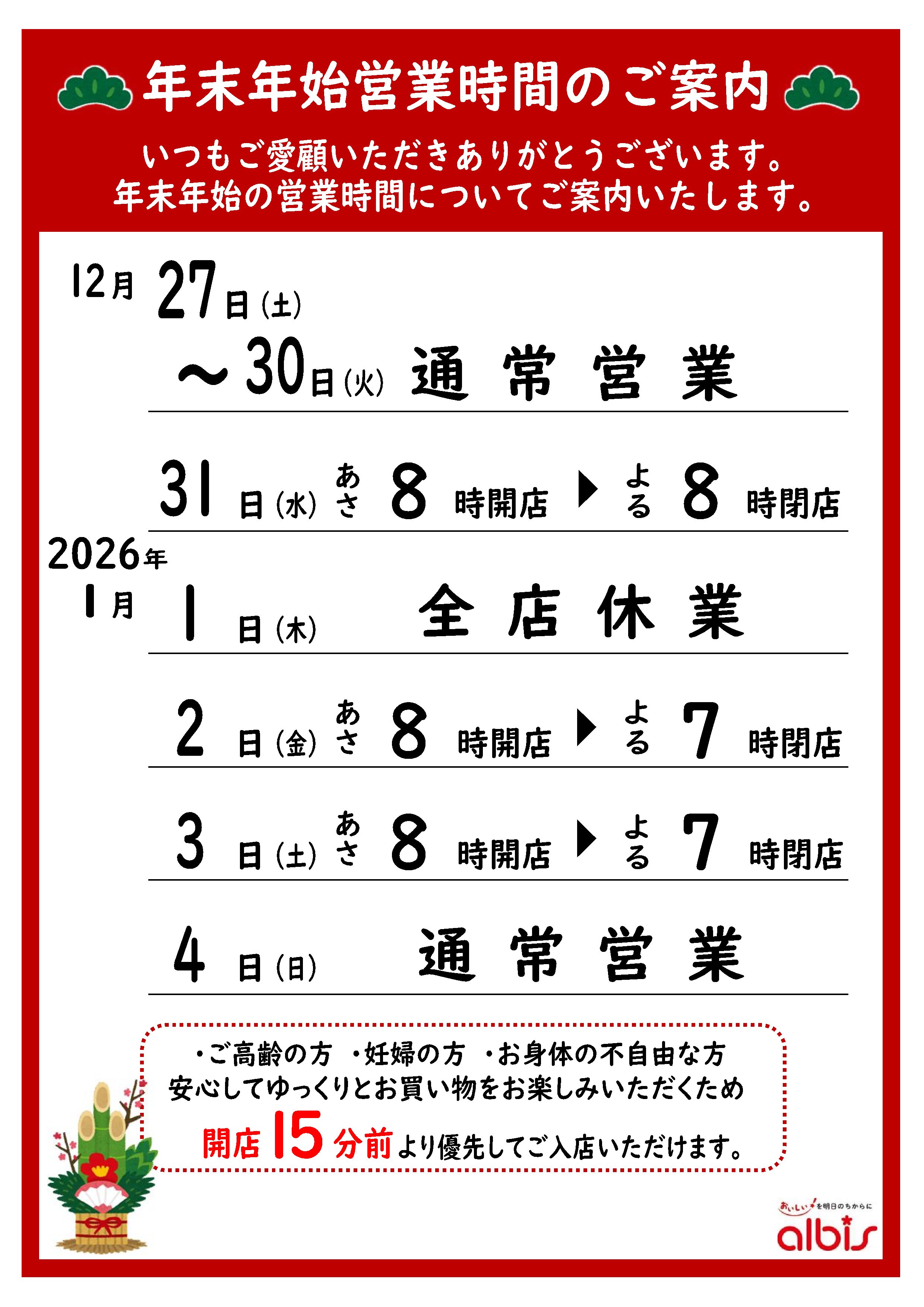年末年始は営業時間が異なりますので、ご来店の際はご注意くださいませ。