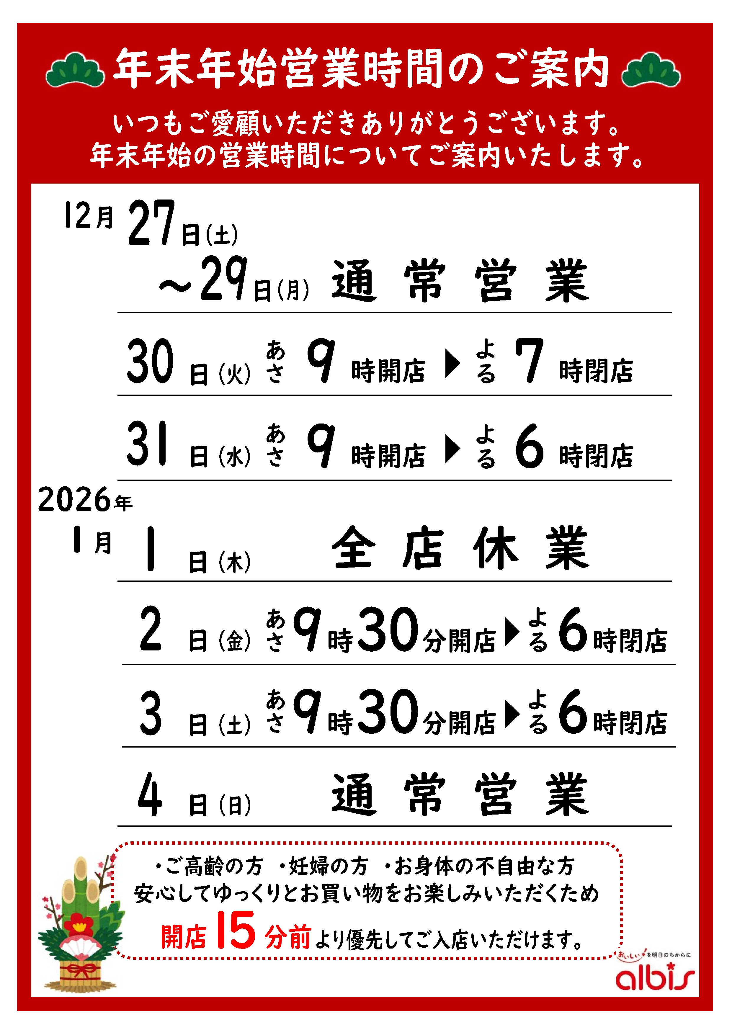 年末年始は営業時間が異なりますので、ご来店の際はご注意くださいませ。